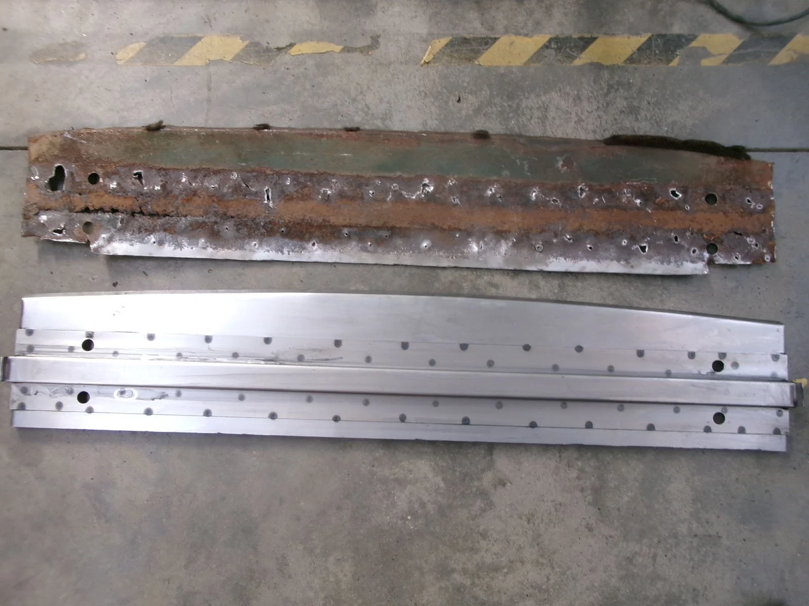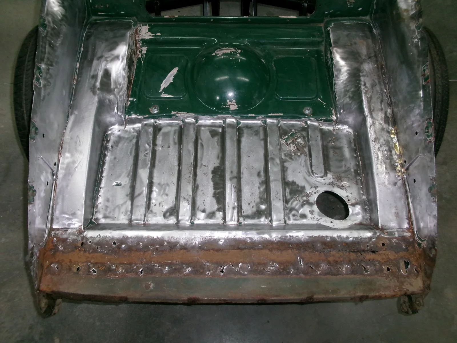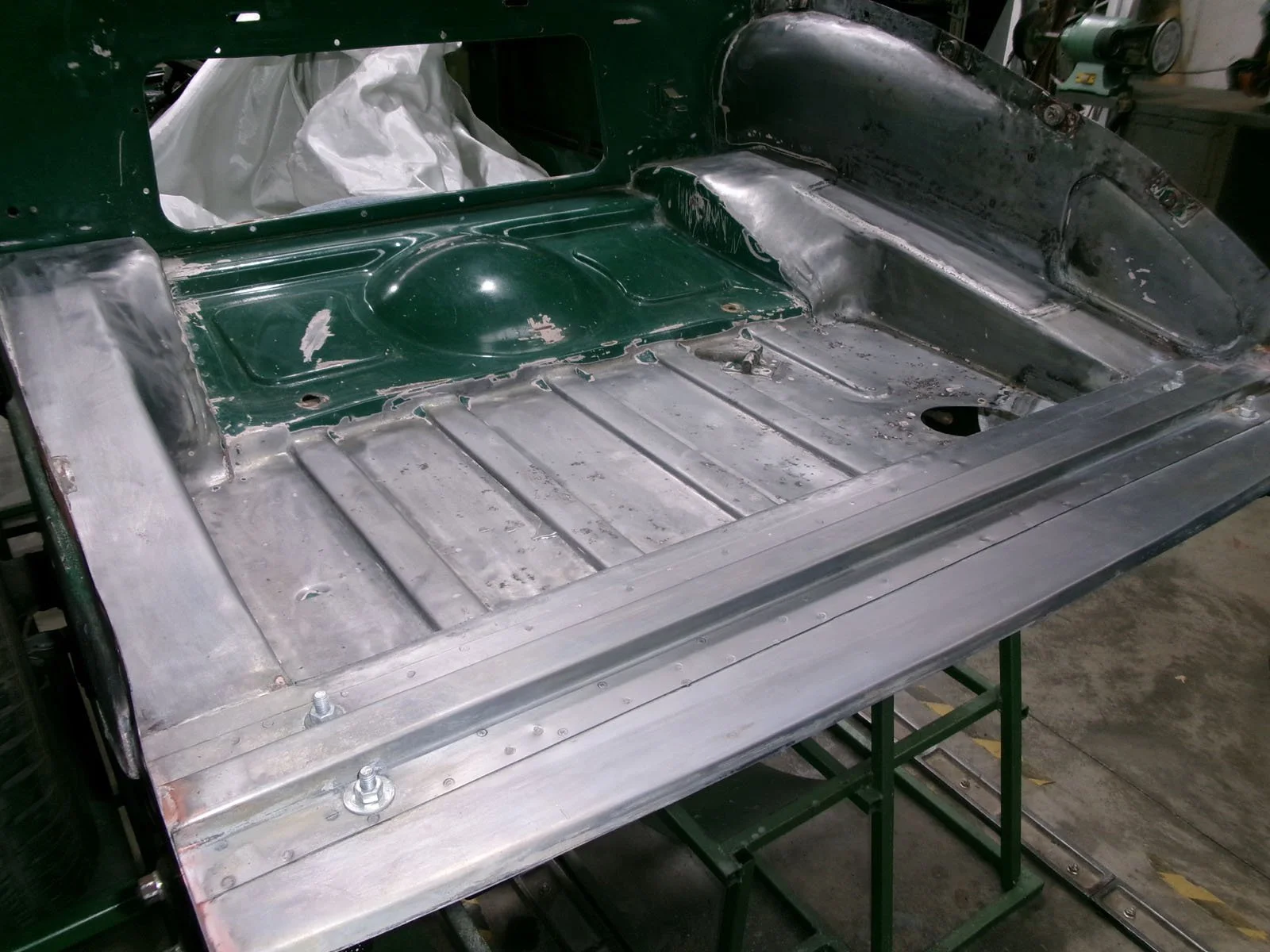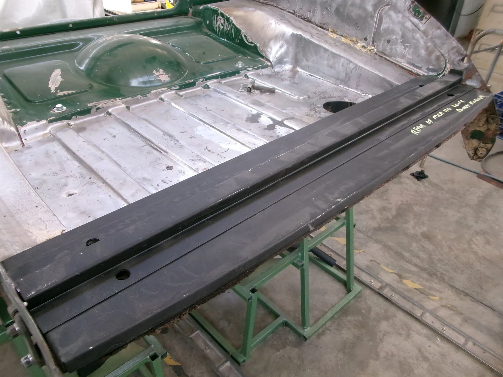 Spot welding the replacement top plate to the chassis.